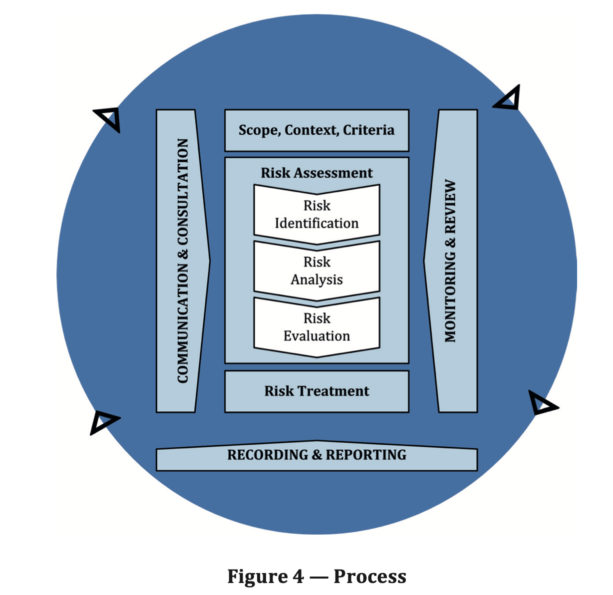 风险管理过程涉及将政策、程序和做法系统地应用到沟通和咨询、建立背景和评估、处理、监测、审查、记录和报告风险等活动中。风险管理过程应当整合到组织管理和决策过程中。